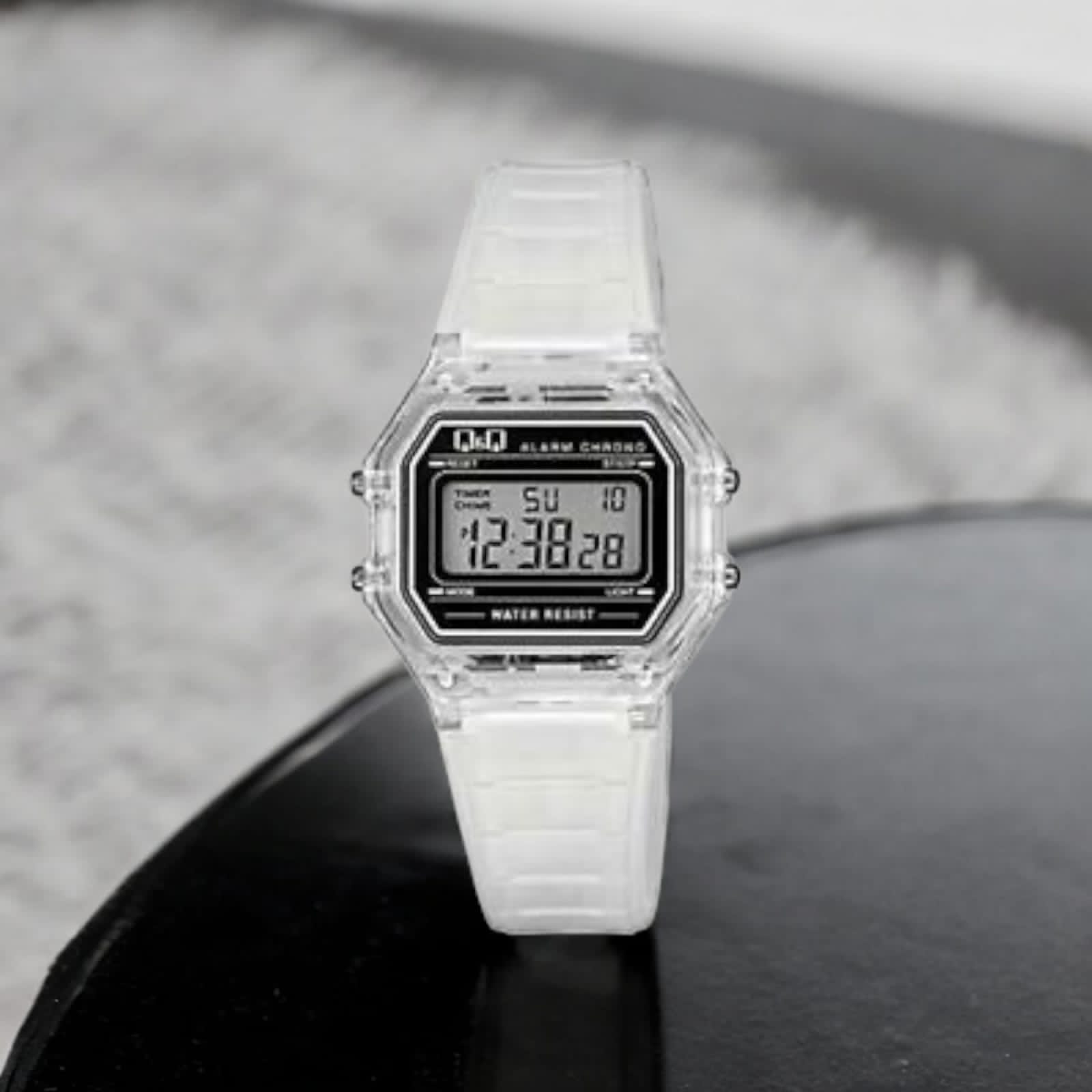 Visualización: Funciones clásicas de reloj: hora, minutos, segundos, pm,9 mes, fecha, día; Cronometro, Dual Time Luz led y Alarma. - Tipo de Movimiento: Bateria - Tamaño de la caja: 33 mm - Cristal: Resina - Material de la correa: Resina. - Material de la Caja/Bisel: Resina. - Resistente al agua: 3 ATM (30 mts)